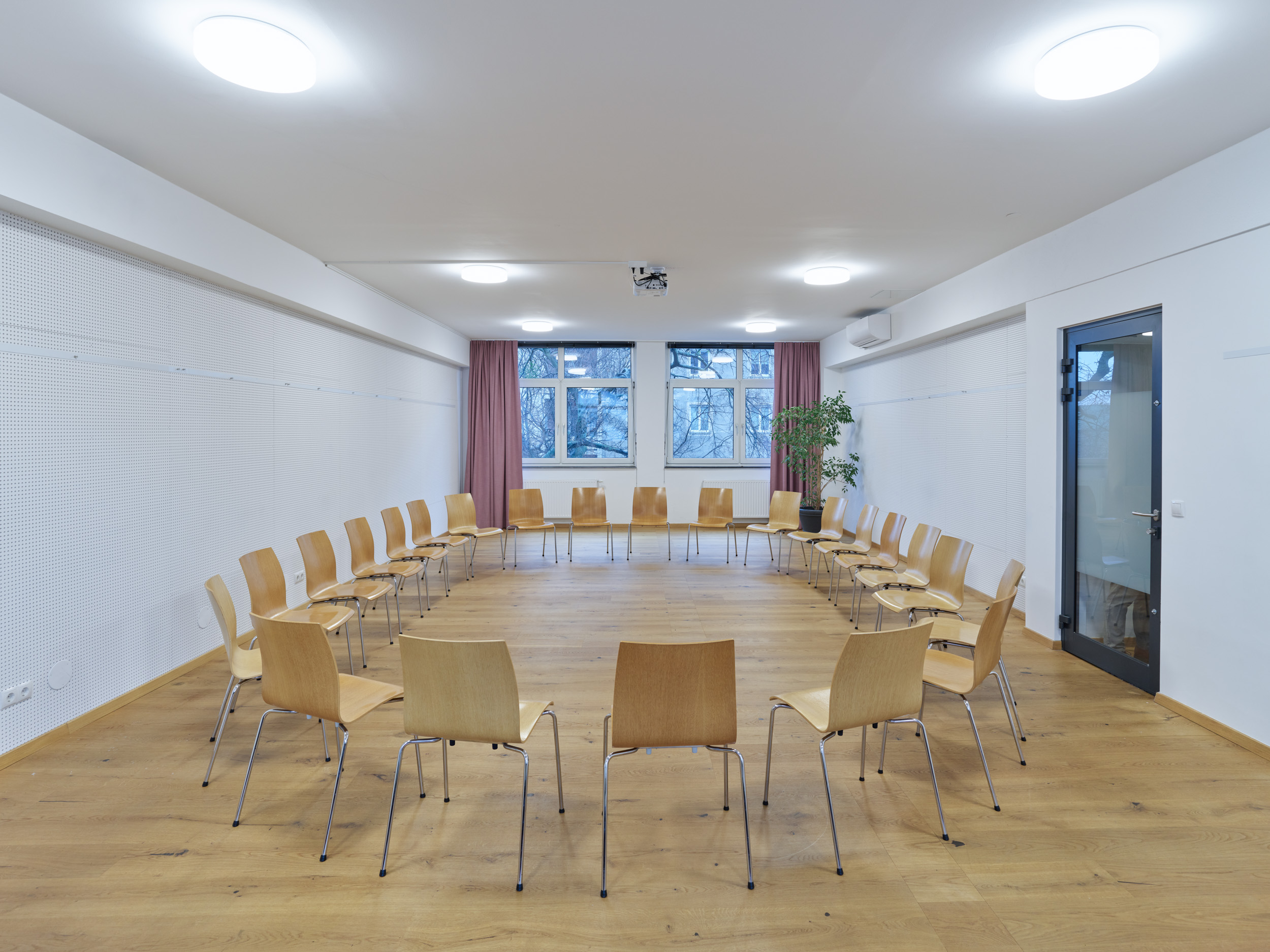 Das Blaue Zimmer erstreckt sich über die ganze Breite des Hauptgebäudes und hat dadurch auf Wunsch zwei helle Fensterfronten. Bei Bedarf wird eine Seite mit Vorhängen verdeckt und die Beamer-Leinwand ausgefahren. Es ist nach dem Salon unser zweitgrößter Raum und kann auch mit exklusiv nutzbaren Neben- und Pausenräumen als Suite gebucht werden. Ideal wenn man neben einem Hauptraum auch noch 2-3 Nebenräume dazu buchen möchte und dabei in einem getrennten Bereich ohne Störung arbeiten kann.